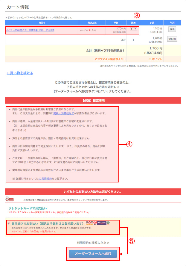 ③注文したい商品の数量が正しくカートに入っているか確認します。