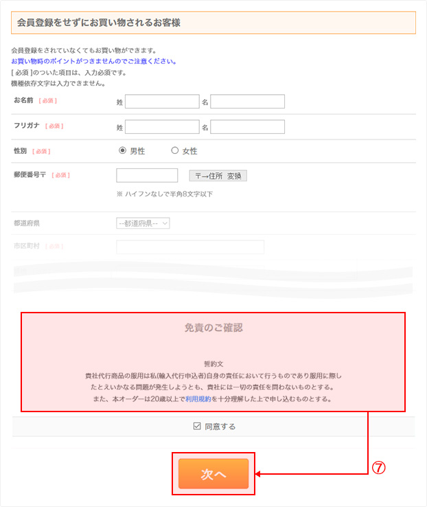 お届け先住所を含むすべての必須項目をご入力いただき、免責を確認後「同意する」を選択し、「次へ」ボタンをクリックします。