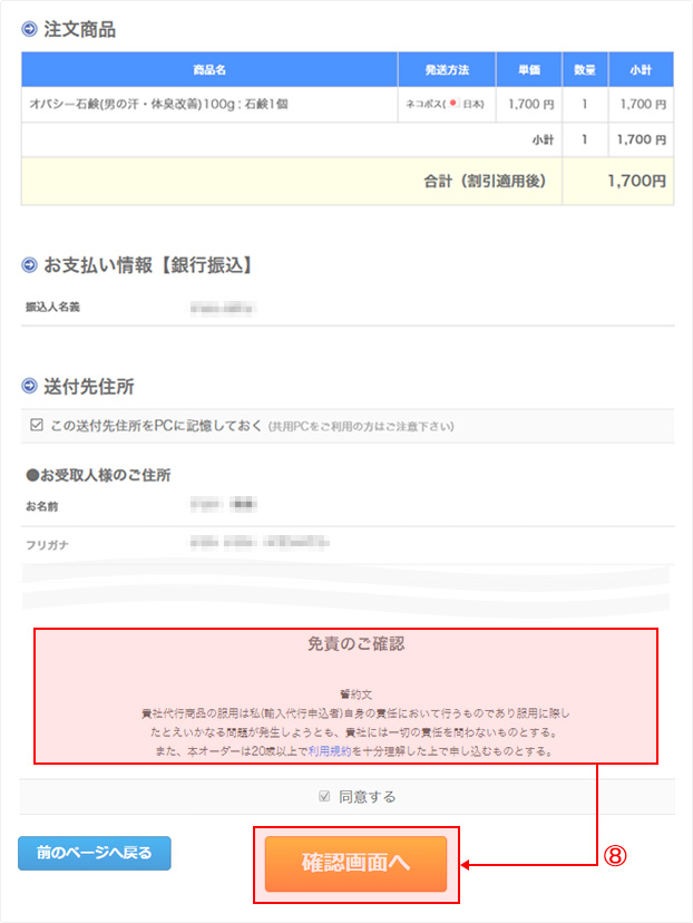 ⑧注文商品、お支払い情報、送付先住所及び免責をご確認後、「同意する」を選択し、「確認画面へ」ボタンをクリックします。