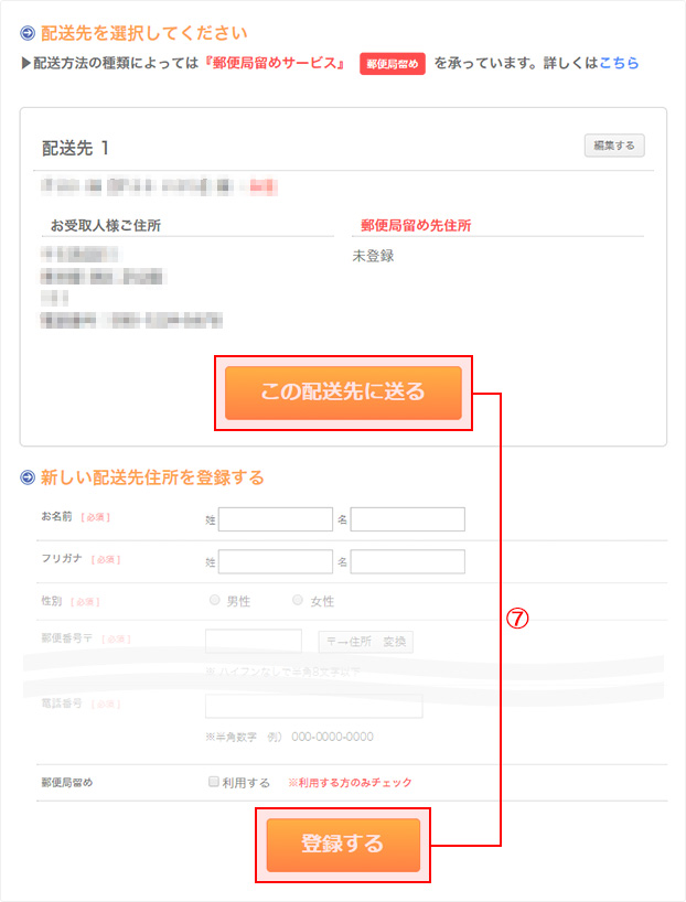 ⑦お届け先の住所を指定します。