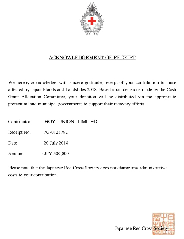 弊社では、今回の豪雨災害におきまして、日本赤十字社へ500,000円を寄付させて頂きました。 一日も早い被災者の生活再建と、被災地の復旧をお祈りいたします